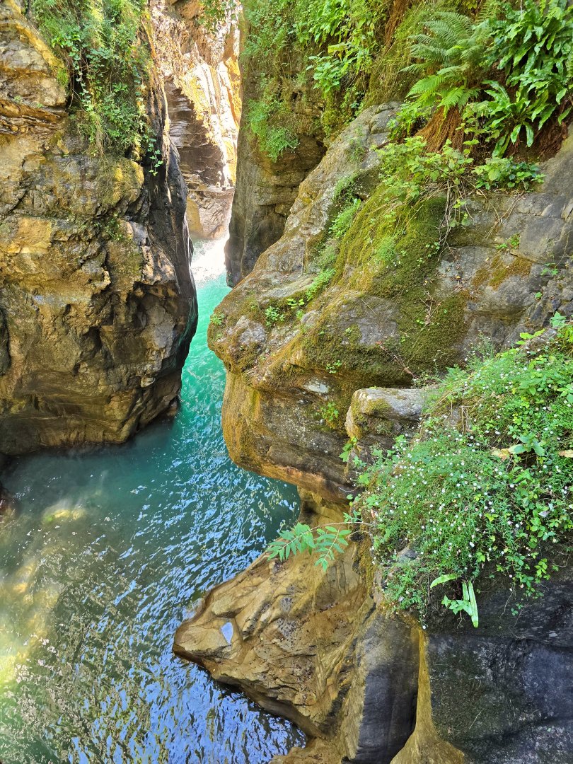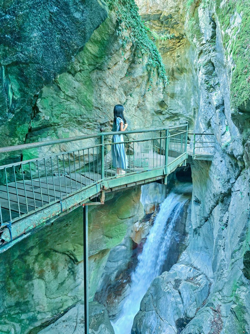 可以沿著步道走在高聳的山壁之間,下方是漂亮的綠色深潭和湍急水流。重點是這裡面超涼又不曬,人也不多,當場獲得小孩稱讚,被選為當日最佳景點。