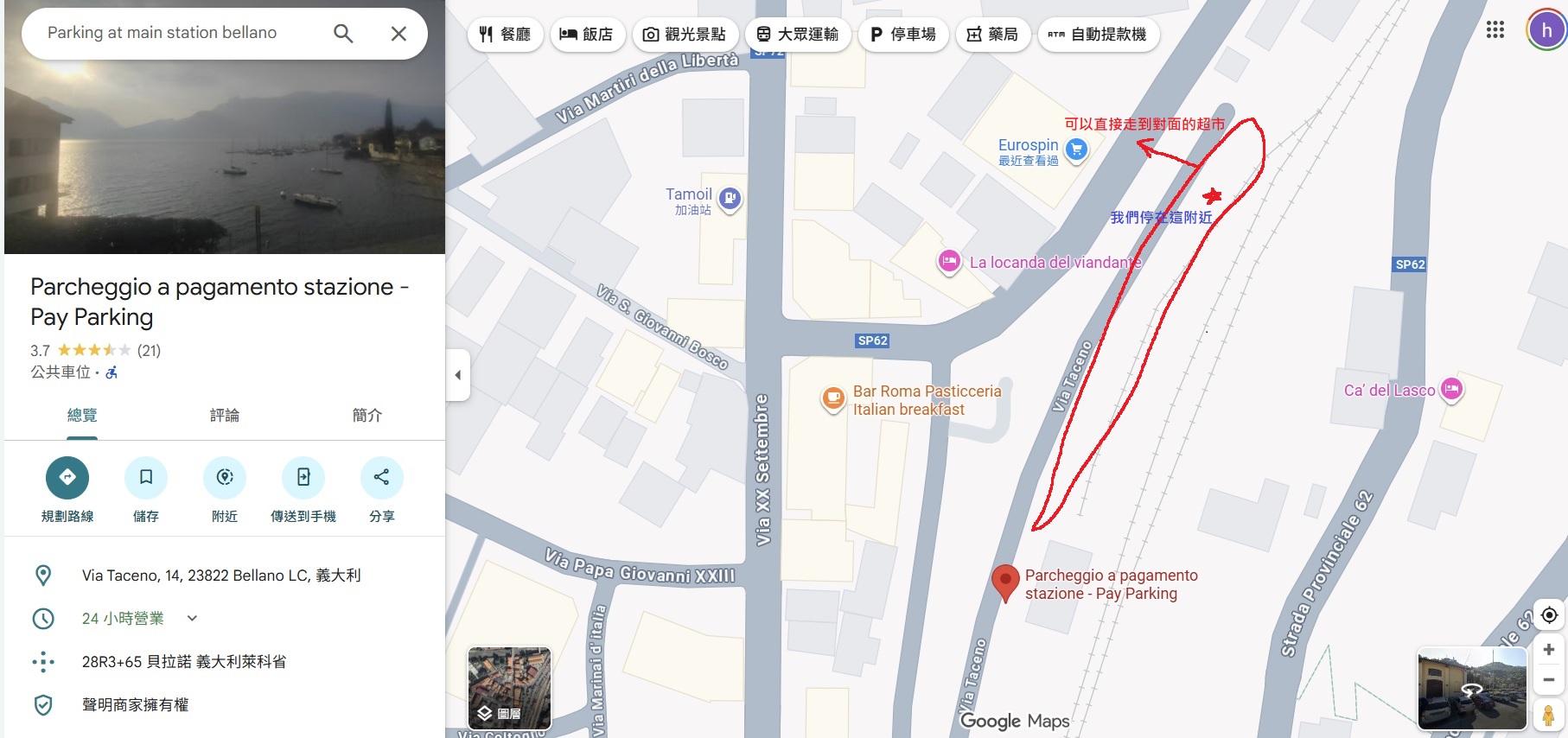 因為看到停車場旁邊剛好有超市,而且我們下一站到Varenna瓦倫納的住宿是公寓式的有廚房可以煮飯,所以我們要開車離開前就先去旁邊的Eurospin超市採買食物。