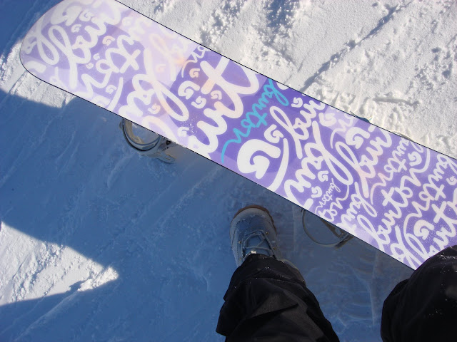 那麼肉腳我還硬要買自己的雪板。沒辦法Burton Ginger實在太可愛了,而且那時候想說買了就不用付租的錢,去個幾次就回本了啊。所以我就買了小朋友用的最大號 — 紫色小飛壘 (因為我覺得紫色的圖案很像飛壘口香糖XD)。再配上白色的Binding,還有白色的靴子 (大心)。:)