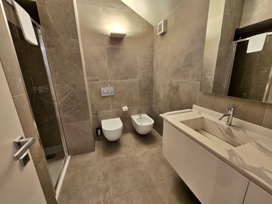 整體空間約九十平方公尺,有兩個房間、一間浴室,以及設備齊全的廚房,包含冰箱、烤箱、洗碗機、咖啡機與餐具,還有一台洗衣機,準備晚餐和早餐的時候面對著無敵湖景超感動。客廳寬敞明亮、浴室很好用、房間和床都很舒適,整間都是很新又很乾淨。公寓內提供免費 Wi-Fi,全區訊號穩定,並設有私人停車位,適合自駕旅客,但要注意的是車子不能太大,不然會停不進車庫裡面,然後,因為公寓是位於ZTL交通限行區內,要記得先跟住宿方說車牌號碼 (拿到租的車之後再傳訊息跟他們說),