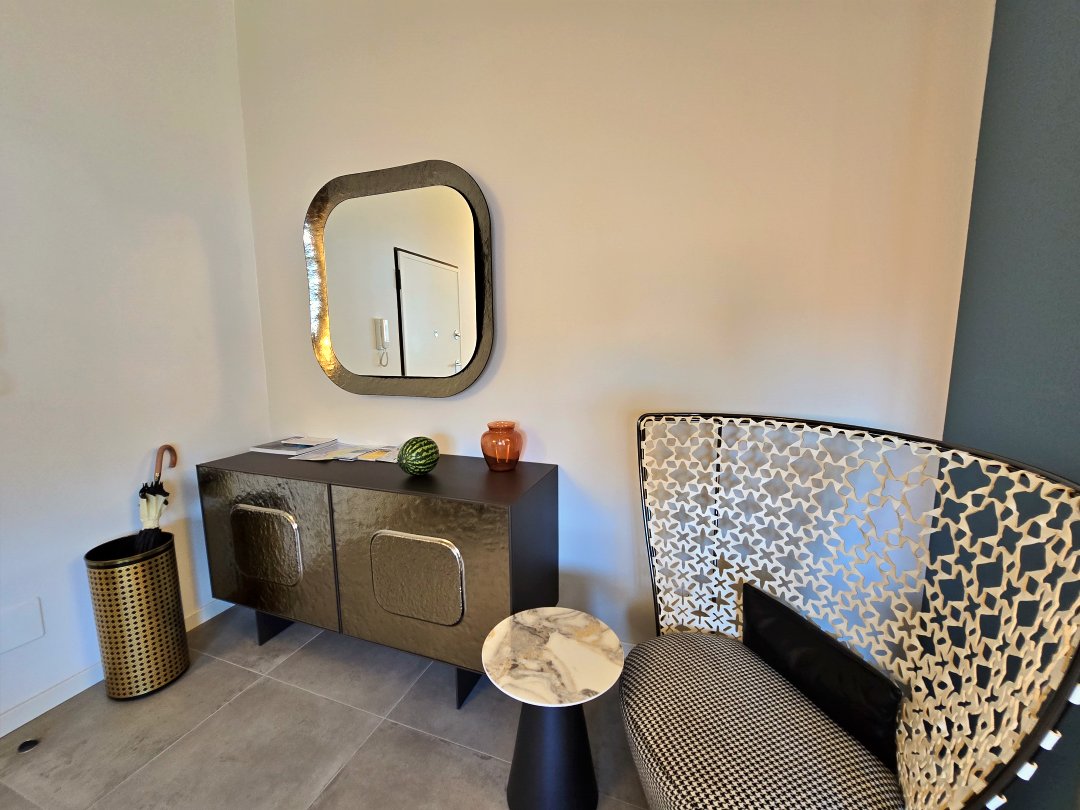 一進門的玄關有鏡子和置物櫃,還有一張造型很特別的椅子。