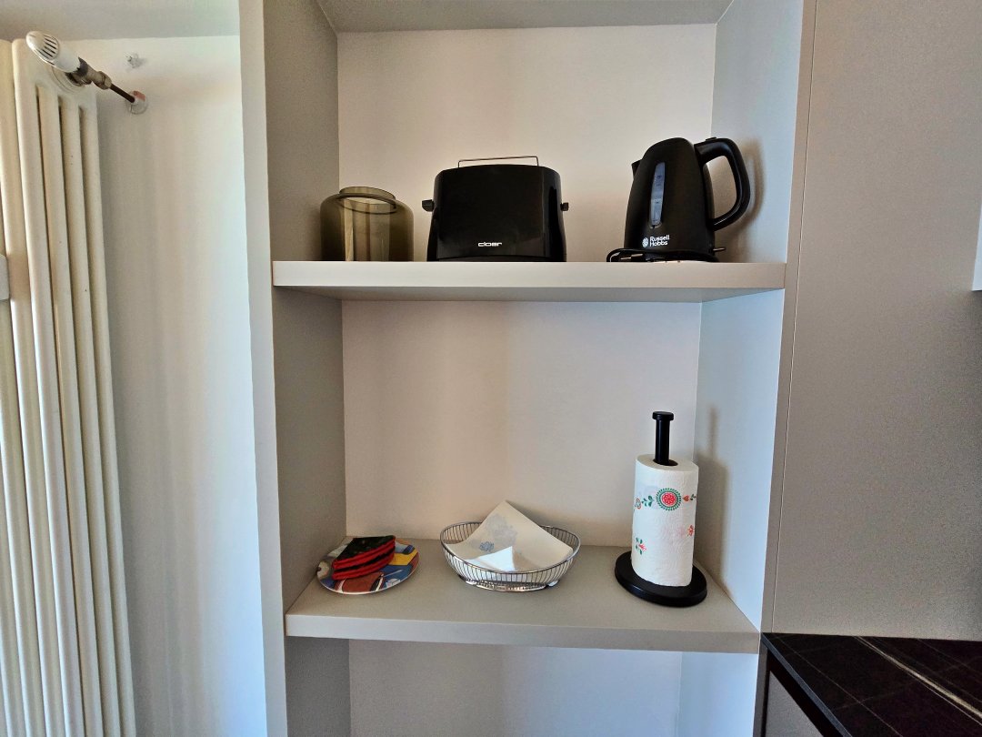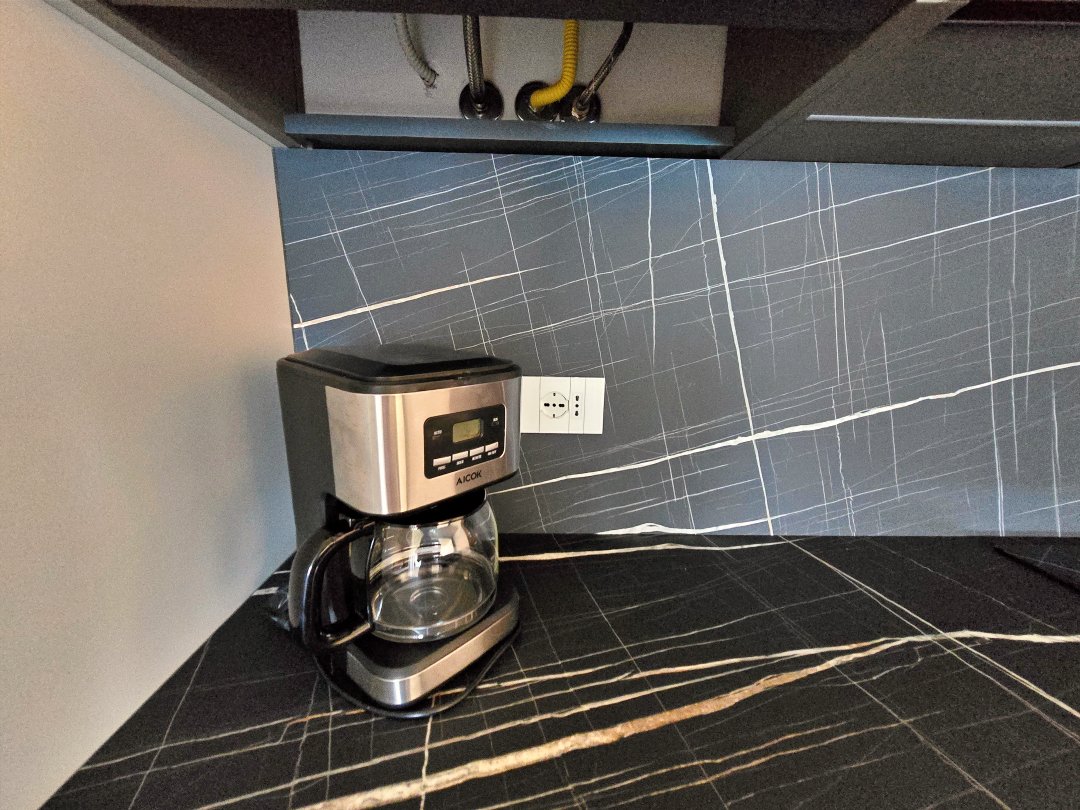 最右邊靠牆是冰箱。洗衣機藏在左邊放咖啡機的檯面下方。這裡的洗衣機只有洗衣功能沒有烘衣功能,後陽台有提供晾衣架。夏天衣服放室外很快就乾,冬天就不確定了。