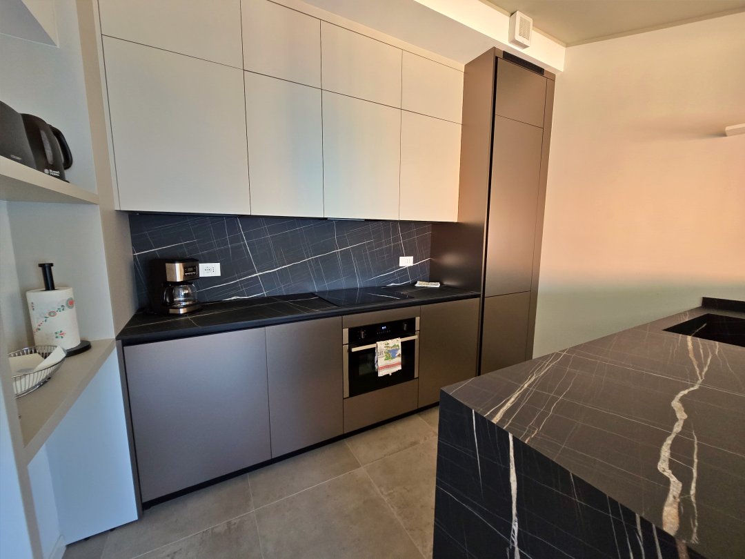 廚房設備很新,黑白的配色簡潔俐落。爐面是電磁爐而非瓦斯,下方是烤箱。