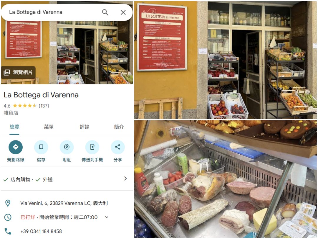 La Bottega di Varenna雜貨店 (地圖連結)。有賣一些蔬菜水果,但是選擇很少,賣相也沒有很好,我們在這裡補充買了一些小黃瓜和番茄。因為Varenna小鎮沒有超市,所以我們主要採購的食物是在前一站Bellano貝拉諾的超市先買好再過來的。