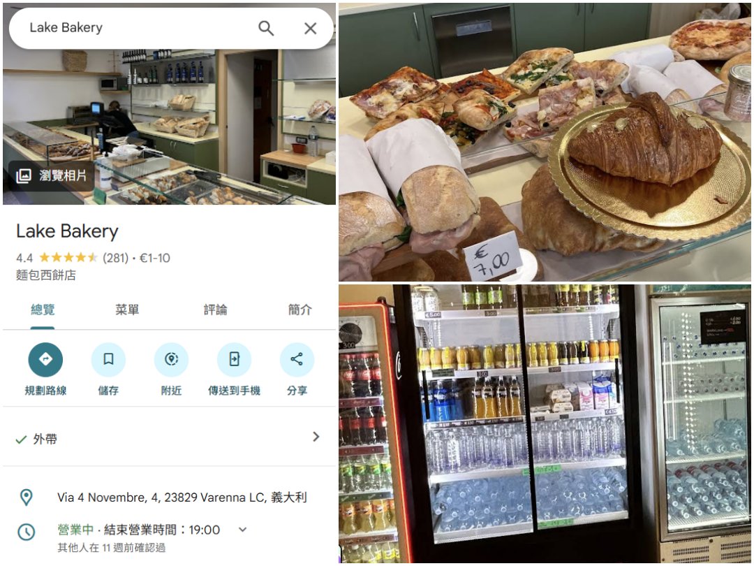 Lake Bakery (地圖連結)。有Pizza、麵包、甜點。我們在這裡買小盒的雞蛋(六個一盒),好吃的優格和礦泉水。早上逛完Varenna Villa Monastero 莊園之後也來這裡買Pizza當午餐回公寓吃,睡個午覺再搭船去Bellagio。